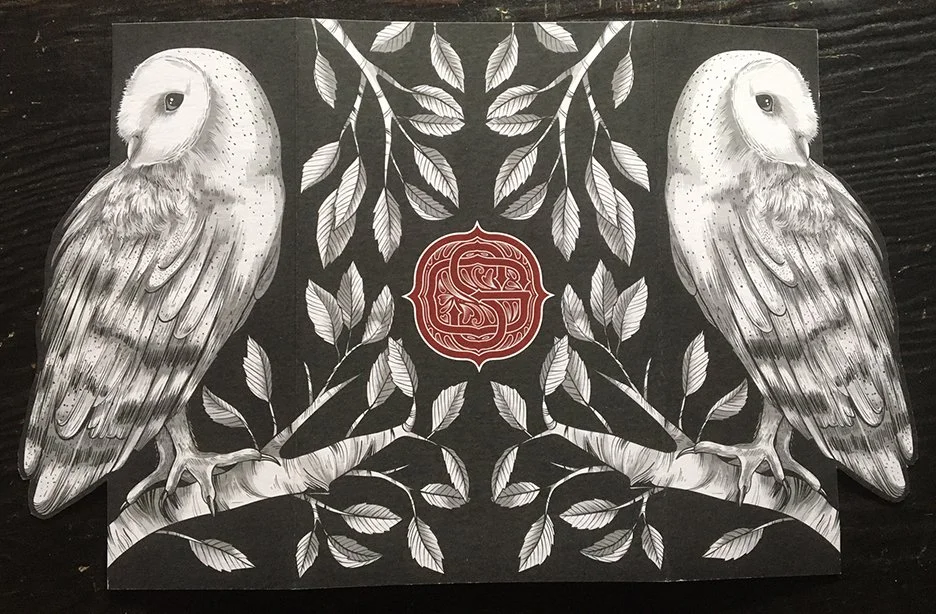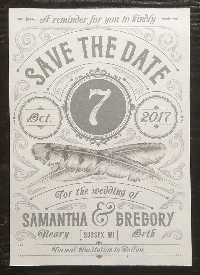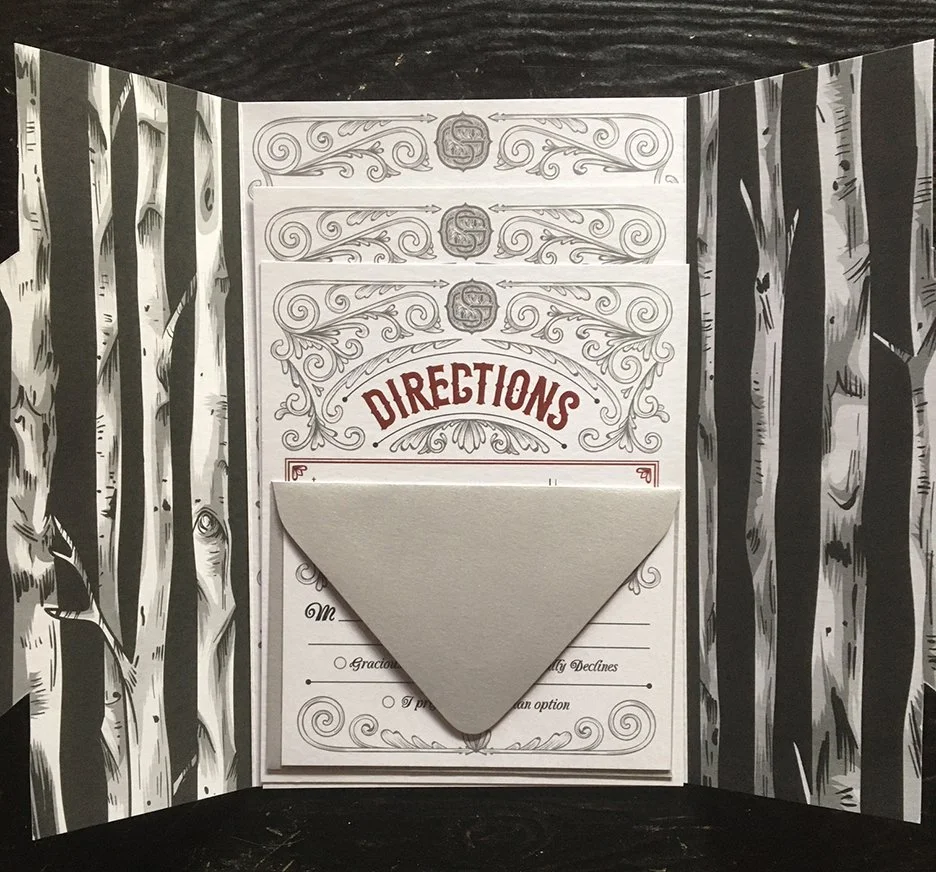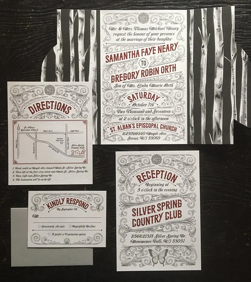 Wedding Invitation Design Client: Neary-Orth Heavily illustrated and with custom typography, this wedding invitation was inspired by a Victorian woodland theme.